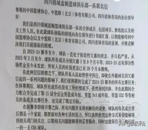 四川男篮球员联名上书中国篮协,希望能得到解决欠薪的问题。截止到如今,四川男篮新赛季的战绩为0胜17负,全联盟唯一0胜的球队。