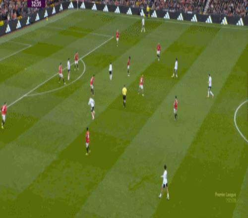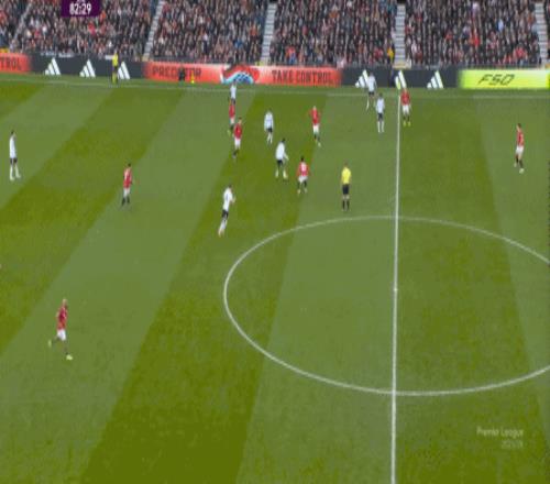 这个时候的曼联,却没有典型的中锋球员可以直接寻找,以此来在重压之下打出一个缺口,只能是等到富勒姆势头消退,来到前场之后,用梅努的斜传来寻找插上的布鲁诺,以此来打一次反制: