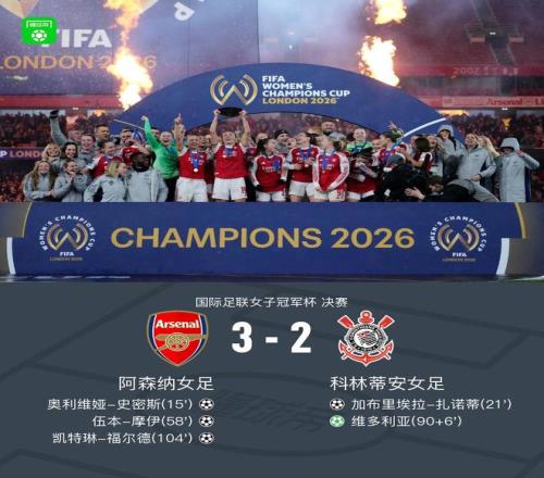 北京时间2月2日国际足联女子冠军杯 决赛,阿森纳女足对阵科林蒂安女足。阿森纳女足奥利维娅-史密斯破门,伍本-摩伊破门,凯特琳-福尔德破门。科林蒂安女足加布里埃拉-扎诺蒂破门,维多利亚破门。最终阿森纳女足3-2科林蒂安女足夺得国际足联女子冠军杯冠军。