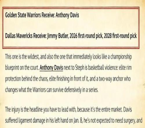 美媒《Fadeaway World》撰文建议,如果得不到字母哥,勇士可以转而追求独行侠前锋戴维斯,并且他们给出了一套交易方案——