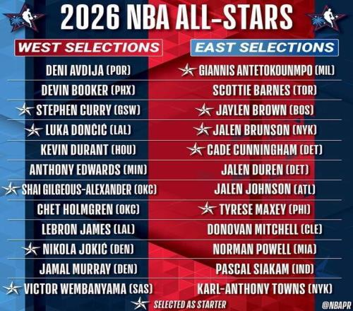 替补阵容西部这边:爱德华兹、霍姆格伦、穆雷、布克、阿夫迪亚、詹姆斯和杜兰特;东部替补则是:米切尔、唐斯、杜伦、杰伦-约翰逊、鲍威尔、巴恩斯和西亚卡姆。